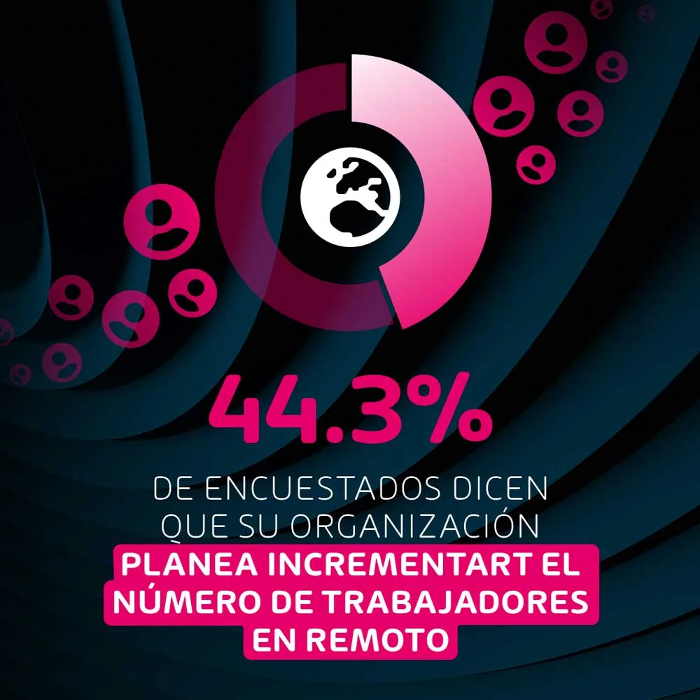 A la pregunta de qué porcentaje de la plantilla de su organización trabaja en remoto, la media de las respuestas de nuestros encuestados fue de casi la mitad: el 47,6%. Aunque no es del todo sorprendente, se trata de un porcentaje muy elevado, sobre todo si se tiene en cuenta que la previsión es que aumente en los próximos años.