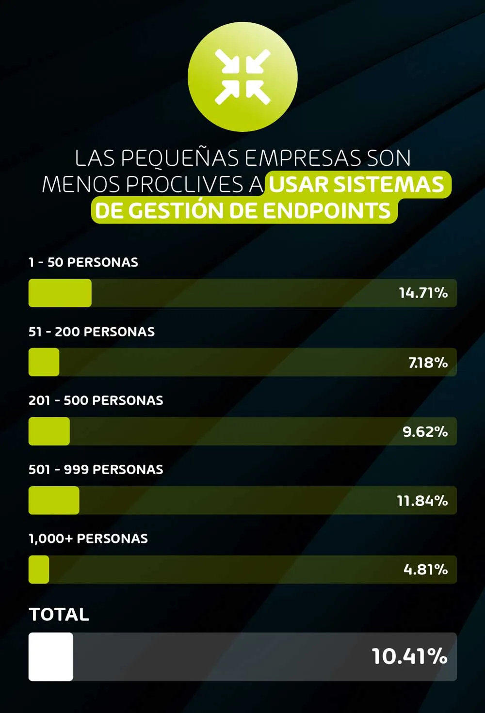 Los sistemas de gestión de endpoints son una herramienta extremadamente útil y básica para las organizaciones y sus proveedores de servicios de IT, sin embargo, casi 1 de cada 10 de nuestros encuestados dicen que su organización no utiliza ninguno de los sistemas disponibles. Esto es más frecuente entre las pymes, donde el 15 % de las organizaciones con entre 1 y 50 empleados afirman no utilizar un sistema de gestión.