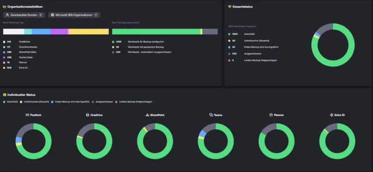 - Multi-Tenancy: Über eine webbasierte Multi-Tenant-Konsole lassen sich alle Microsoft 365 Unternehmens- und Windows-Endpoint-Backups überwachen und verwalten. Dabei sind pro Organisation individuelle Einstellungen wählbar.