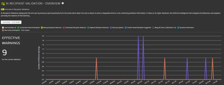 AI Recipient Validation von Hornetsecurity ist ein E-Mail-Validierungstool, das E-Mail-Benutzer schützt, indem es ihnen hilft, immer die richtigen Empfänger auszuwählen. Es gibt Sicherheits- und Compliance-Verantwortlichen einen echten Überblick darüber, wie Mitarbeiter dazu beitragen, fehlgeleiteten E-Mails vorzubeugen.