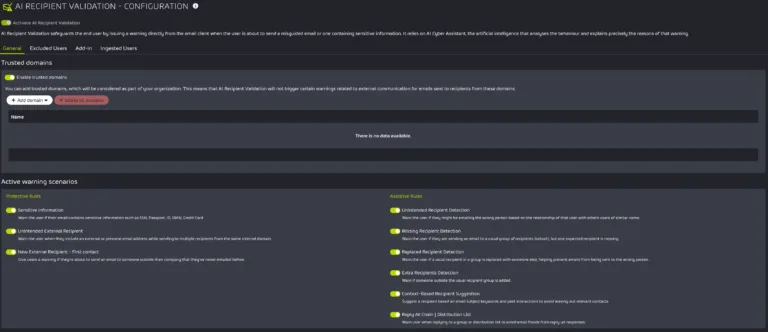 Administratoren können konfigurieren, wann AI Recipient Validation Warnungen auslöst. Die Einstellungsmöglichkeiten sind: