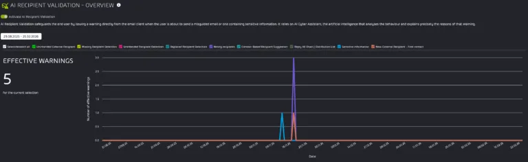 Das AI Recipient Validation Dashboard bietet Administratoren einen Überblick über die verschiedenen Warnungen, die Benutzer erhalten haben, sowie über die Aktionen der Benutzer nach dem Erhalt der Warnungen.